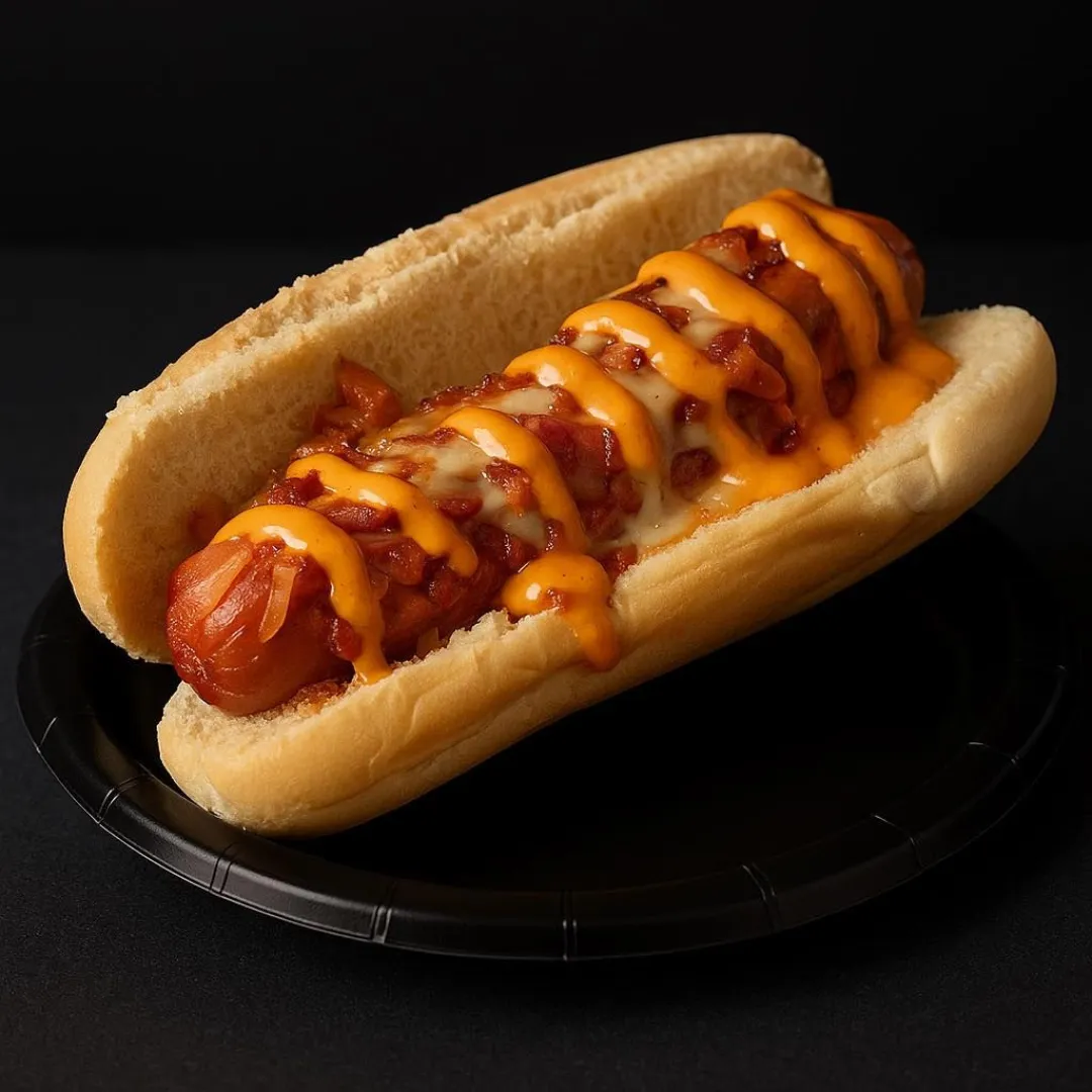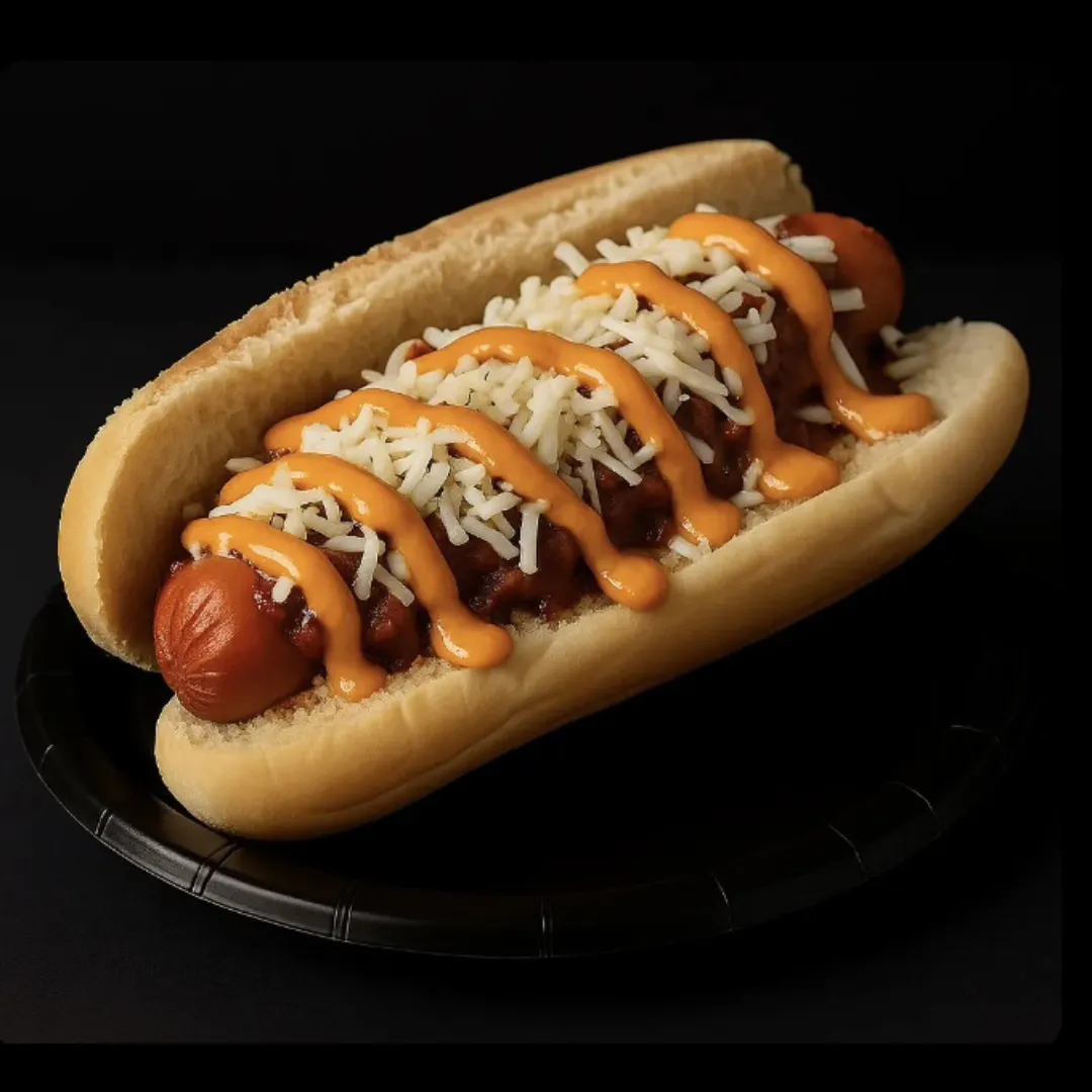 Dive into our chili dog, loaded with savory chili, creamy shredded white cheese, and a drizzle of our signature hustle sauce. A must-try for chili lovers!
